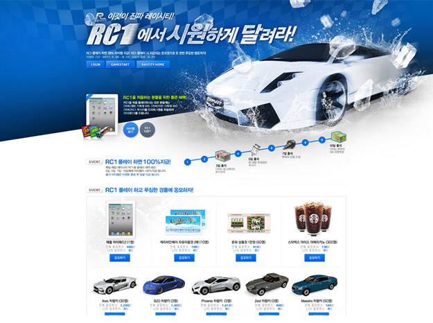 上圖,將背景旋轉(zhuǎn)后,大面積的斜面產(chǎn)生了很強(qiáng)的速度感,賽車急速飛馳著,好像下一秒就要從電腦中沖出來一樣,傾斜的大標(biāo)題和旋轉(zhuǎn)后的背景交叉配合,使畫面整個(gè)都運(yùn)動(dòng)起來。這種方法可以應(yīng)用到很多運(yùn)動(dòng)的主題上。