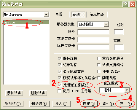 4.點擊上圖 6 處, 切換到“高級”標簽(如下圖)。 在1處選中剛建立的站點名稱(mysite),將2處的選鉤鉤上,在3處的“傳送模式”選擇二進制,點擊4處“應用”。至此您的FTP站點已經(jīng)建立成功;