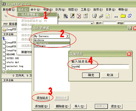 2. 運行 LeapFTP,點擊1處(站點->站點管理器),彈出“站點管理器”窗口;在2處選擇“My Servers”項,然后在3處點擊“添加站點”按鈕,在彈出的窗口4處輸入您喜歡的站點名稱(如:mysite);