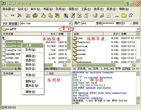 6.連接成功后的界面如下圖所示。左上框為本地目錄,您可以通過 1 處的下拉菜單選擇您要上傳文件的目錄,選擇后該目錄下的所有文件都會顯示在這個框里。 選擇您要上傳的文件,并點鼠標“右鏈”->“上傳”, 這時在隊列欄里會顯示正在上傳及未上傳的文件, 當您的文件上傳成功完成后,在命令欄里會出現(xiàn)“傳送完成”的提示,此時在過程目錄欄里就可以看到您上傳的文件了。