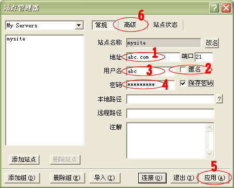 3.點擊“確定”后,出現(xiàn)以下界面。在1處輸入您的站點地址(如:abc.com),將2處“匿名”前的選鉤去掉,在3處輸入FTP用戶名(如:abc),在4處輸入FTP密碼(將保存密碼前的選鉤打上),點擊5處“應用”按鈕;