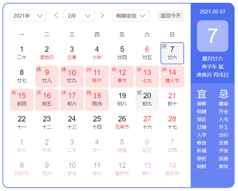 根據(jù)國(guó)家法定節(jié)假日安排,并結(jié)合本重慶公司情況,于2月9日——2月18日實(shí)施2021年春節(jié)休假,共10天,于2月19日(正月初八)恢復(fù)上班。休假期間,服務(wù)不斷電(023-65309616)!