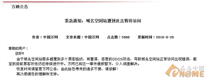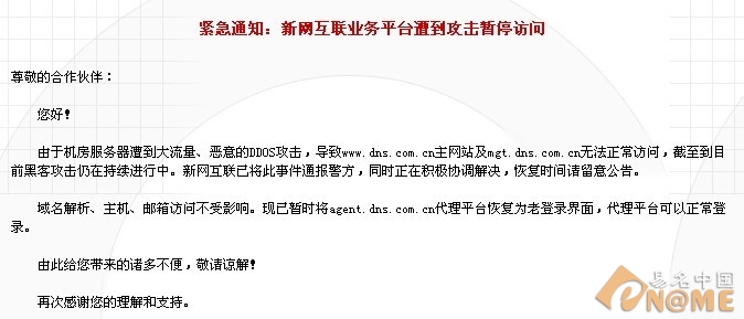 易名中國(9月3日)訊,據(jù)悉,連日來已有萬網(wǎng)、新網(wǎng)、新網(wǎng)互聯(lián)等域名注冊商連續(xù)遭遇黑客折DDOS惡意攻擊,造成大部分域名訪問出錯、DNS服務(wù)器異常、域名功能管理暫停等問題,損失巨大,目前萬網(wǎng)、新網(wǎng)互聯(lián)、新網(wǎng)總部稱已上報警方。